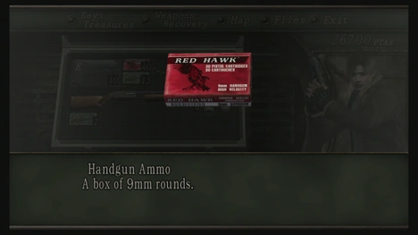 Vienen en pequeñas cajas rojas de marca "Red Hawk" con un águila e información acerca de la munición. La capacidad máxima es de 50 balas de 9mm por caja. Como al principio del juego Leon sólo tiene como arma la pistola, a lo largo del capitulo 1-1 es el tipo de munición más encontrada sobre todo en las chozas antes de llegar al Pueblo.